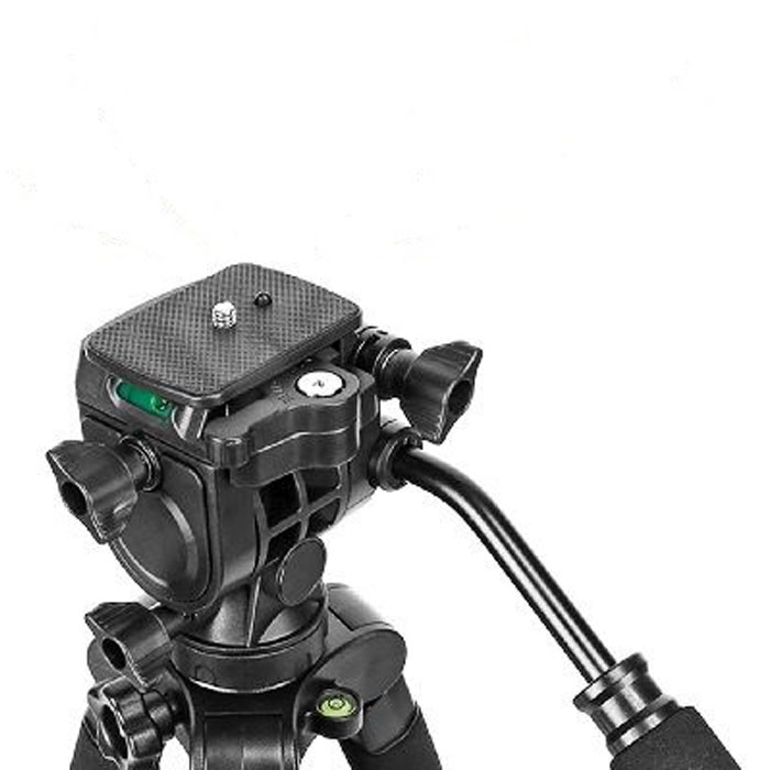 The video tripod is mainly made of high-quality aluminum alloy, lightweight but durable. Max. load capacity is 10kg. With a 1/4 inch camera screw on its top, it is compatible with most DSLR/ ILDC cameras/ DVs/ smartphone+phone holder kits. It adopts the hydraulic damping head, which ensures the stable and smooth operation of your photography equipment on it. Tilting angle: -90° to +90°; Panning angle: 360°. Support 90° vertical shooting and 360° panoramic photography. Two built-in bubble levels in the tripod for the horizontal position. Its extendable long handle can be installed on the right or left of the damping head for inching adjusting. Dual-lock for quick-release plate and the second safety locking pin prevents equipment from unexpected dropping. Adopt the flip buckle design (with strong locking) on 4-section extendable tripod legs and adjustable center shaft, the tripod height can be easily and quickly adjusted from 54cm to 170cm. Multiple tripod height choices satisfy your different photography requirements. The center shaft can be taken out, which can be applied as a camera monopod or converted into a hiking alpenstock. The metal mid-spreader makes the tripod more stable. Rubber feet for smooth or uneven ground to prevent skidding. Comes with a portable soft carrying bag.